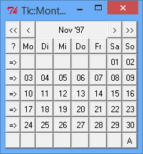 Von Tk::Month kann eigentlich nur abgeraten werden. Die Defaults des Widgets sind nicht portabel, die Dokumentation ist unvollständig und schlecht und der Funktionsumfang lässt zu wünschen übrig. Eine weitaus bessere Option ist der Tk::MiniCalendar. Siehe auch: Übersicht über Widgets zur Datumsauswahl.